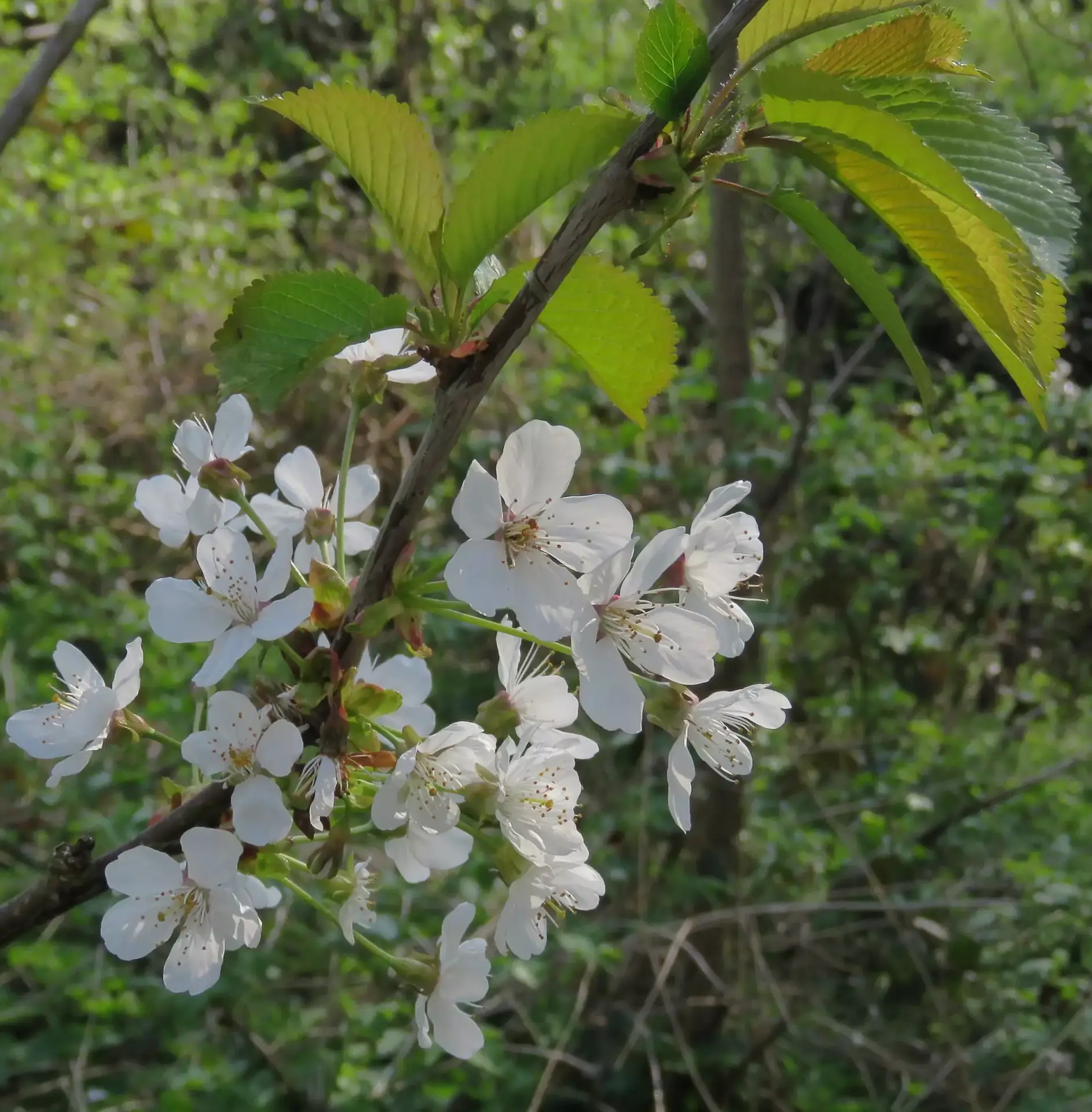 In contrast, Wild Cherry (Prunus avium) has clusters of white flowers coming from the same point and the leaves are toothed with obvious ribbed veins.