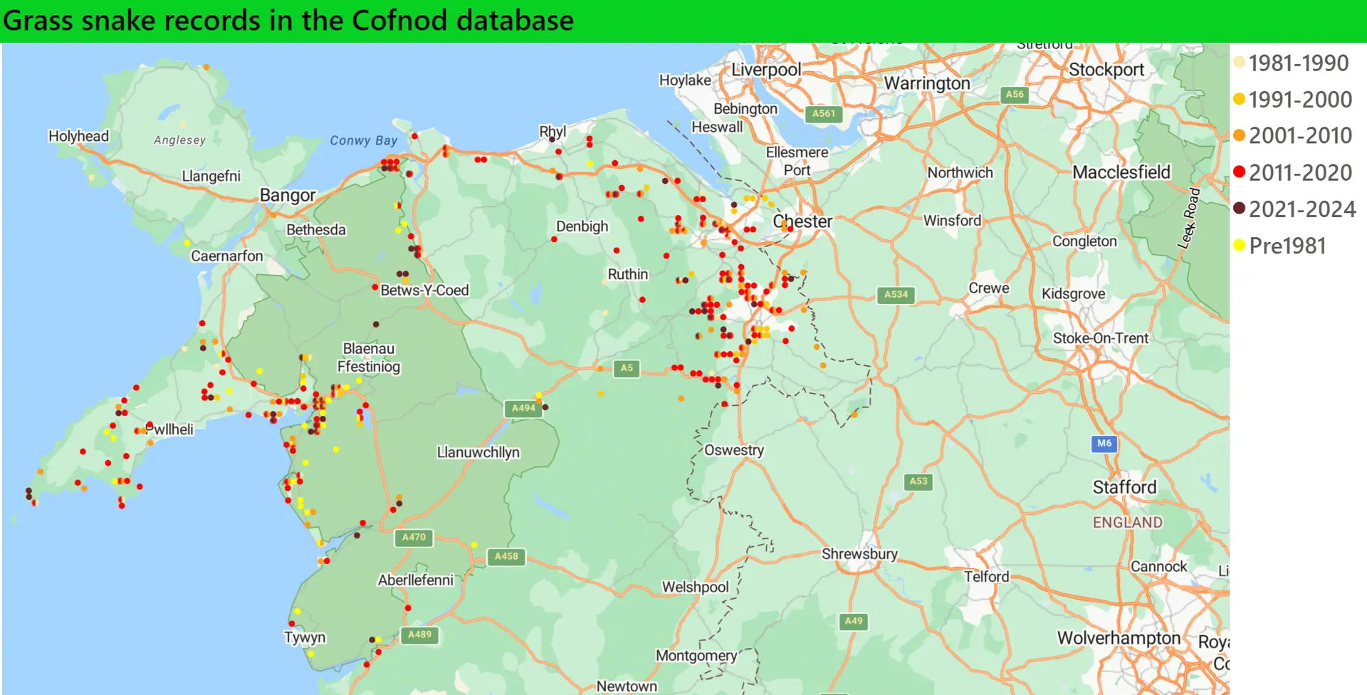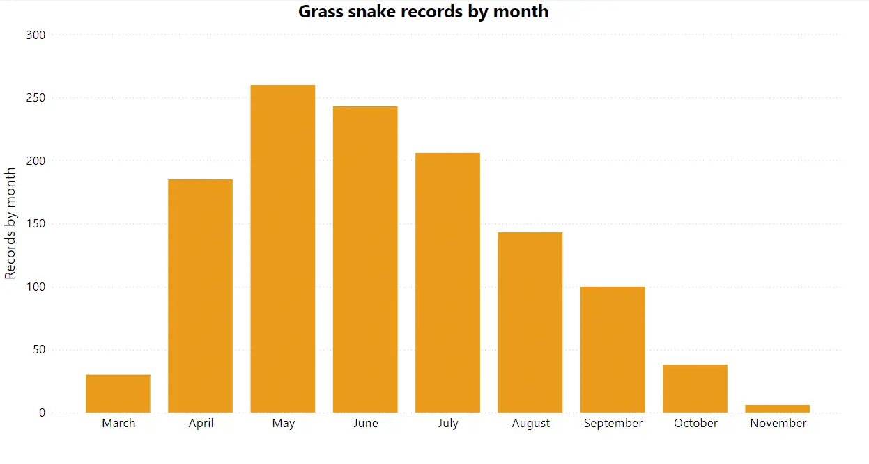 Grass Snakes are widespread in North Wales but largely restricted to lowland areas where they are associated with river valleys, lakes and ponds which provide their preferred amphibian and fish prey. Unlike the Adder which gives birth to live young, the Grass Snake lays eggs which need an external source of heat for incubation. Clutches of 10-40 eggs are laid in damp, warm, rotting vegetation in June and early July. This frequently brings snakes into gardens, allotments and farmyards in search of compost heaps and manure piles.