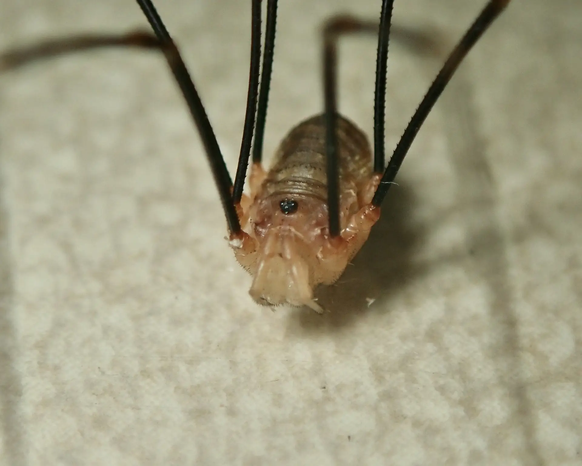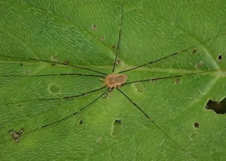 Unlike spiders, harvestmen don’t produce silk and also lack venom. They eat a variety of small invertebrates and will even scavenge dead prey and nibble fruit!