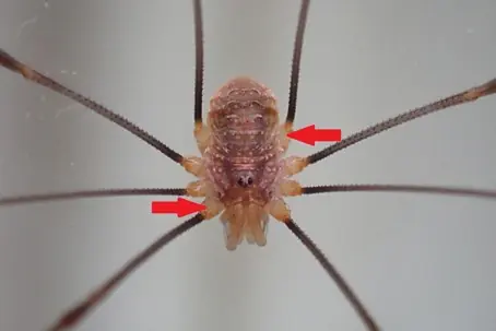 Opilio canestrinii is easily distinguished from other large UK harvestman by the orange colour of its leg bases (trochanter segment arrowed).