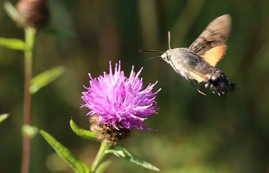 Whilst some moths are challenging to identify, often requiring dissection and examination of internal organs, many others are readily identifiable without even needing to be caught. One such is the Hummingbird Hawk-moth Macroglossum stellatarum), a day-flying moth which can be seen anywhere and has been seen in every month of the year. It is especially frequent in gardens where it zooms around, pausing to hover in front of one flower after another. The resemblance to a Hummingbird is remarkable – the insect and the birds have adopted the same feeding strategy.