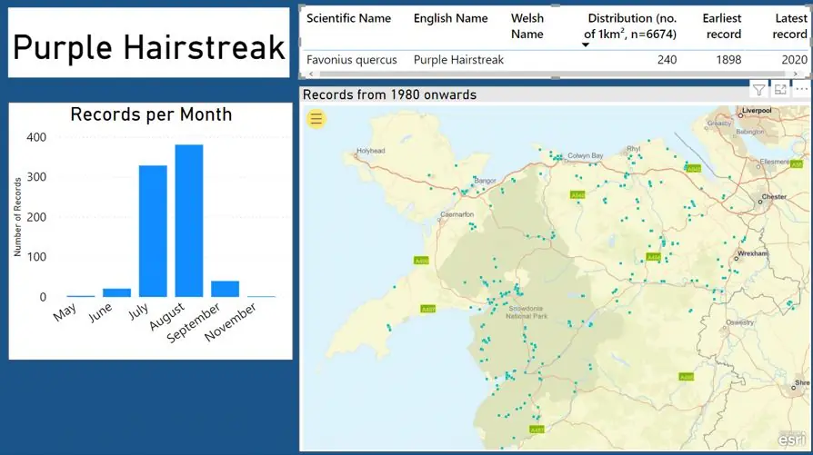 Andrew notes that this species is scarce in Anglesey due to the infrequency of oak trees but can be very common in parts of Snowdonia. So, here’s your August challenge – to find and record Purple Hairstreak butterflies in North Wales. Please submit your records via the Cofnod ORS or by using the LERC Wales App.