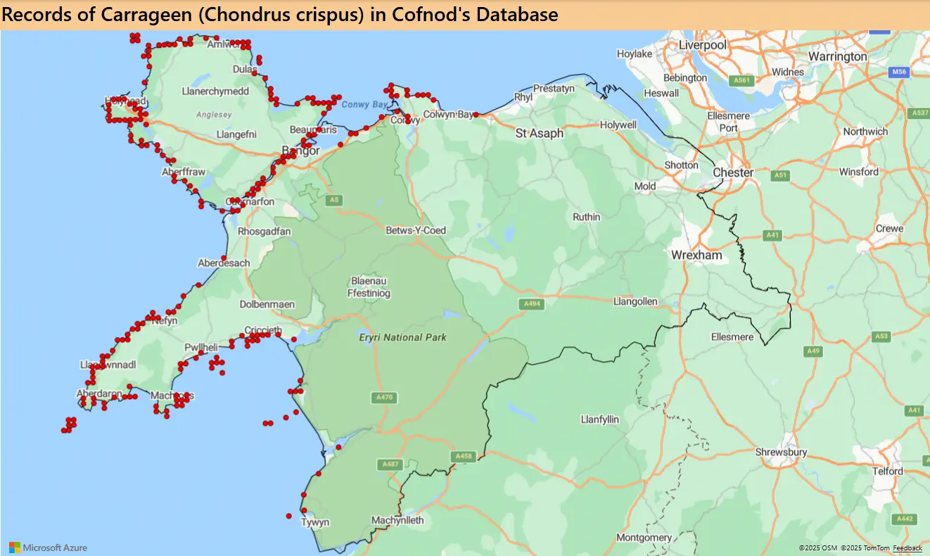 Carrageen is one of the more edible seaweeds, mainly used as a thickener in soups, stews or to make vegetarian junket (blancmange). Give it a go, but just make sure you wash the sand off first! Records show a decline in recent years, probably due to changing recording behaviour, rather than reduction in presence, but to confirm this, please submit your records, ideally with photos, to the Cofnod ORS or the LERC Wales App.