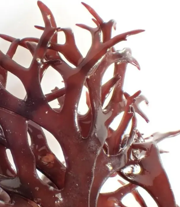 Carrageen is a red seaweed (macroalga), between 5 and 25 cm, typically a maroon colour, but after exposure to excessive sunlight, can be bleached to green or even white. This illustrates the presence of the green pigment chlorophyll as well as the red pigment phycoerythrin.