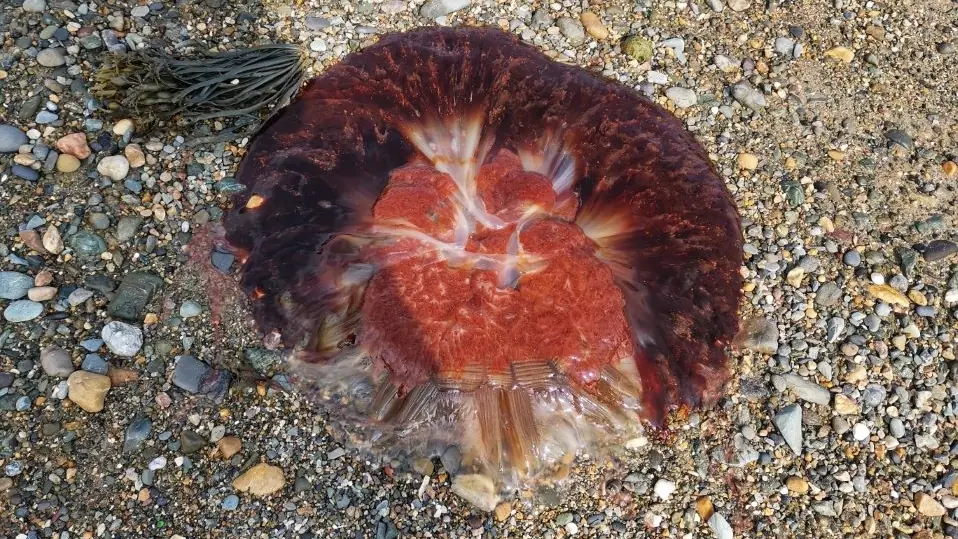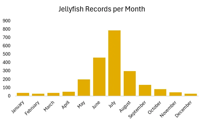 We have found our most common jellies arriving on our shores in stages from May with the Moon jellies (Aurelia aurita), then the Compass jellies (Chrysaora hysoscella), then Lion’s Manes (Cyanea capillata) during the summer months and Barrels (Rhizostoma octopus) being seen through the year. More recently, they’ve been coming in altogether.