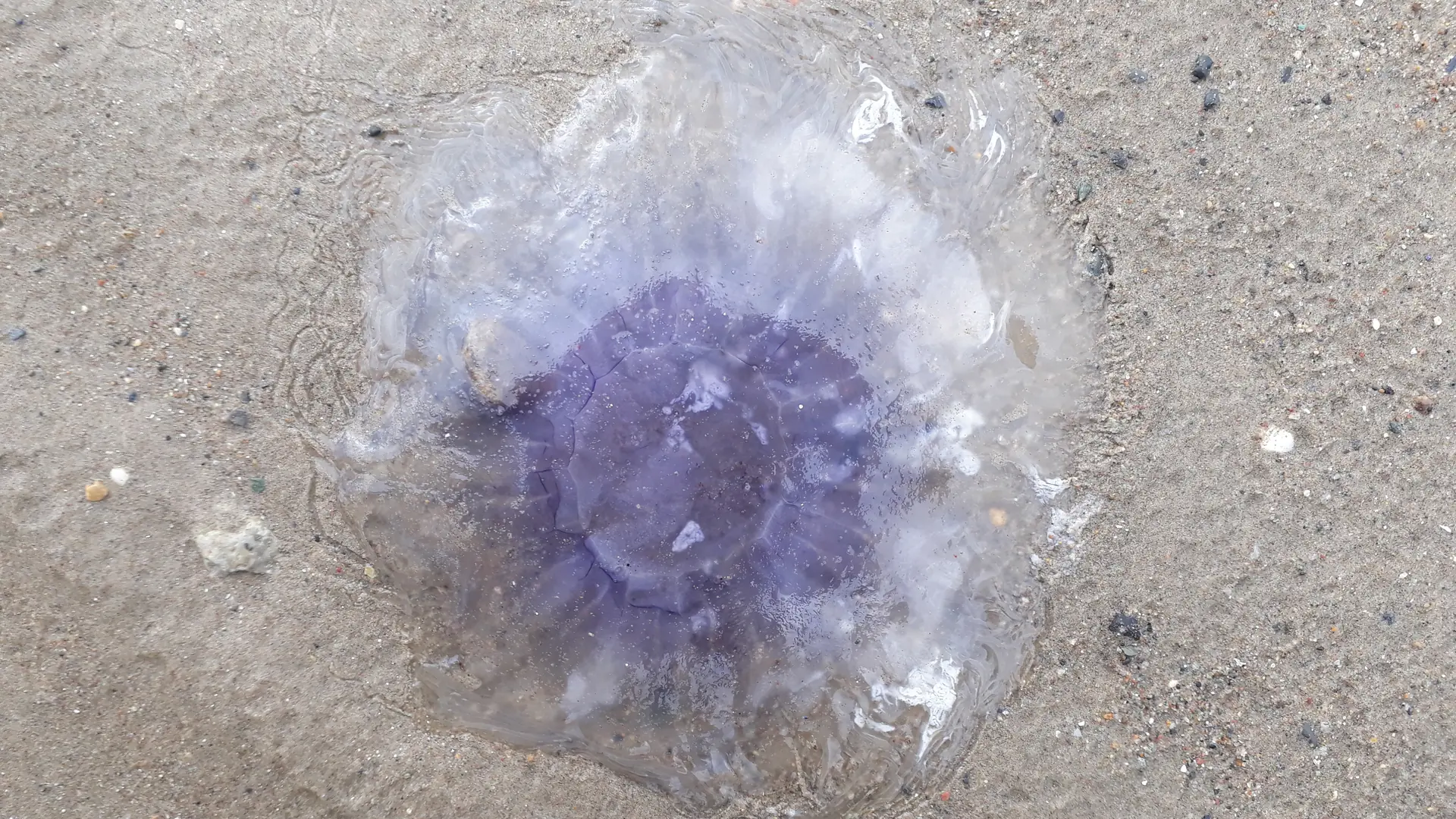 For our most common jelly species look for brown dots on the bell edge and/or lines radiating from the centre of the bell for the Compass jelly. The Moon jelly is no bigger than a side plate with, if intact, four central pink circles within the bell. The Barrel can have a blue or reddish hue (but not colour) and has an overall chunky look to it. The Lion’s Mane is red-orange in colour, large and looks almost fluffy. The Blue jelly (Cyanea lamarckii) is its smaller relative and deep blue in colour, rather than red.