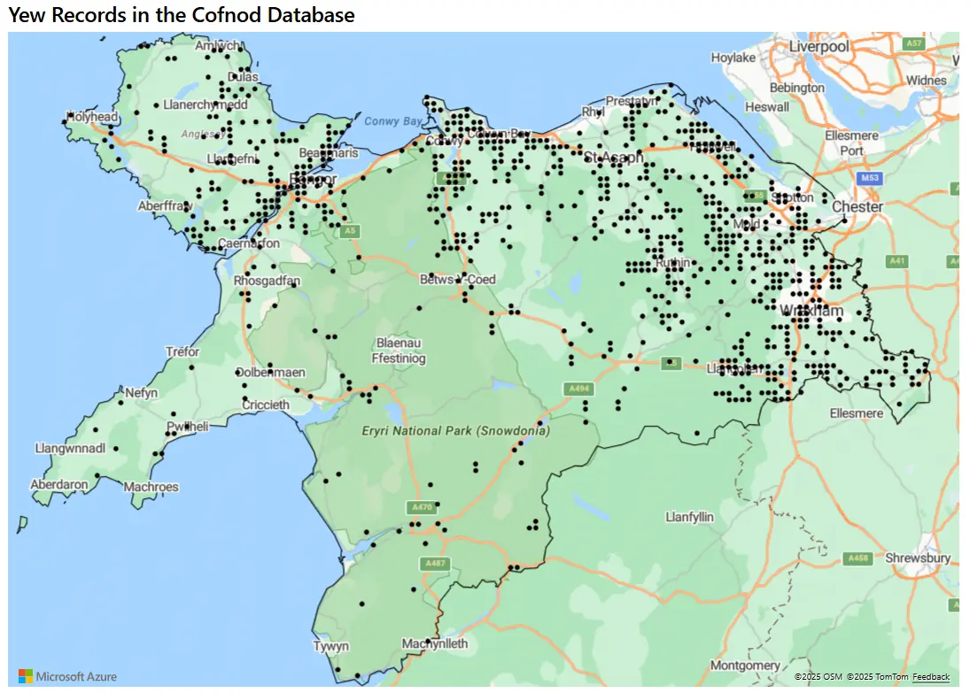 As a widely introduced species it is commonplace in churchyards, parks and gardens from where it readily spreads by seeds which are distributed long distances by foraging members of the Thrush family. As a result, on Anglesey for example, self-sown plants from introduced horticultural and historic sources are now widespread, covering over 100 monads out of an island total of 800. Whether or not there are any truly native Yew on Anglesey is debatable. Griffith (1895) regarded it as rare on the island and only lists anthropogenic sites.