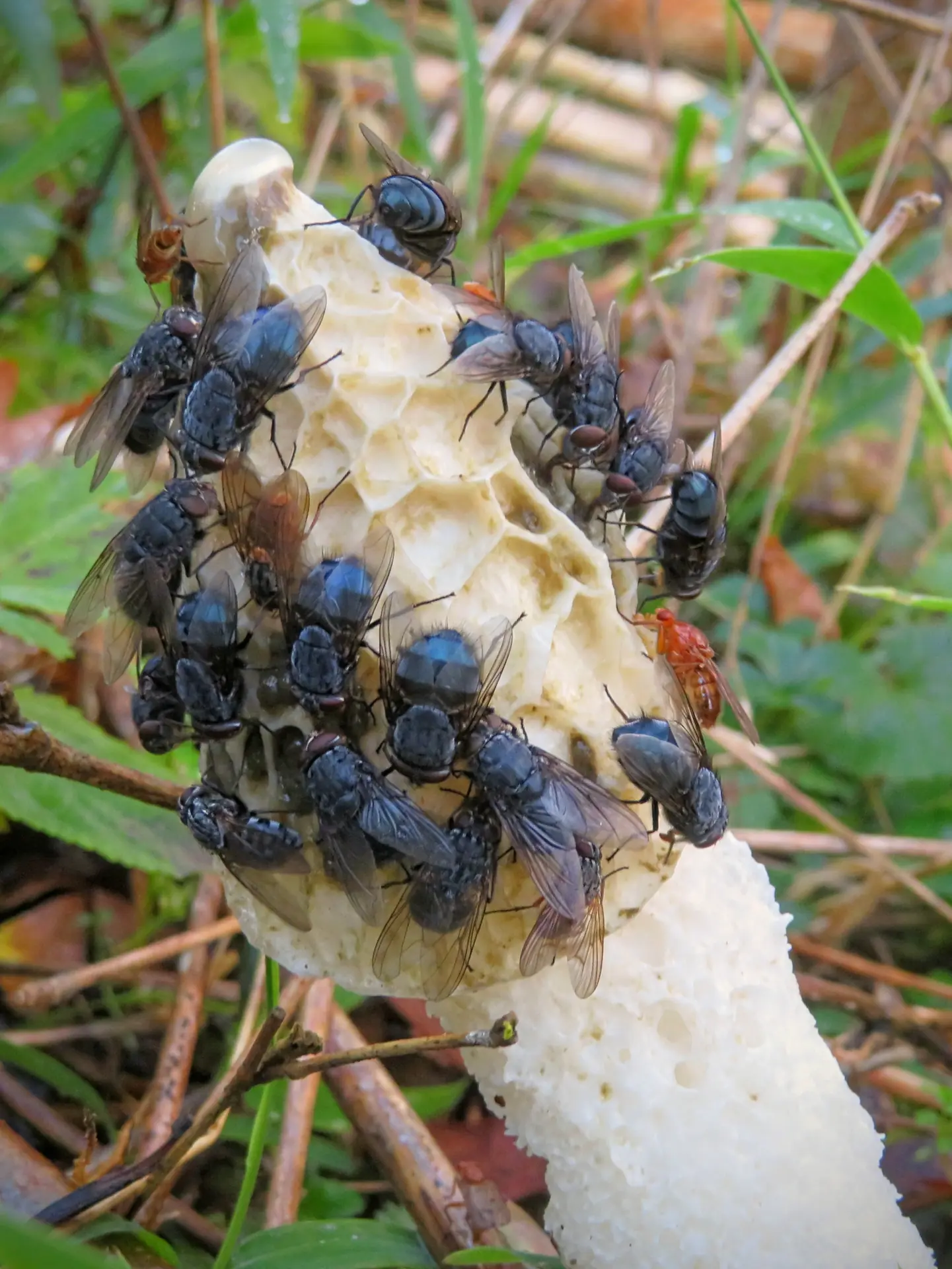 I am talking about the Stinkhorn (Phallus impudicus), which smells of rotting flesh. Once smelt the Stinkhorn is not forgotten. The reason it smells so bad is to attract the flies, which land on the spore-bearing top of the fungus and then disperse the sporeson their feet. The smell can travel some distance. I rarely get a whiff of this species, look down and see it. More commonly you have to follow your nose and look through the undergrowth until you eventually find it.