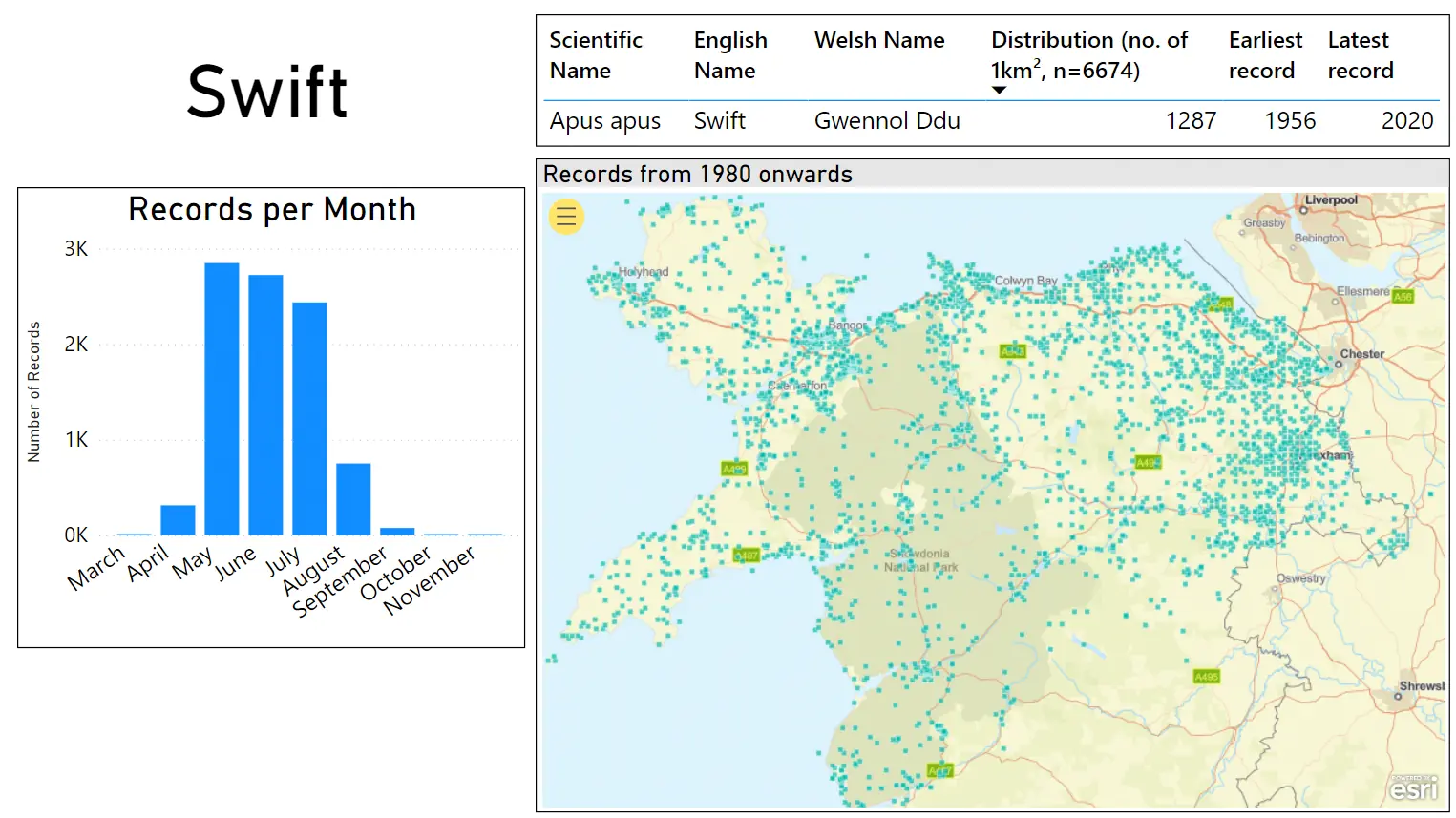 This North Wales Wildlfe Trust project is particularly interested in gathering information on Swift colonies and potential nesting behaviour. Enter your records on Cofnod’s website clicking on A Swift Recovery when prompted.